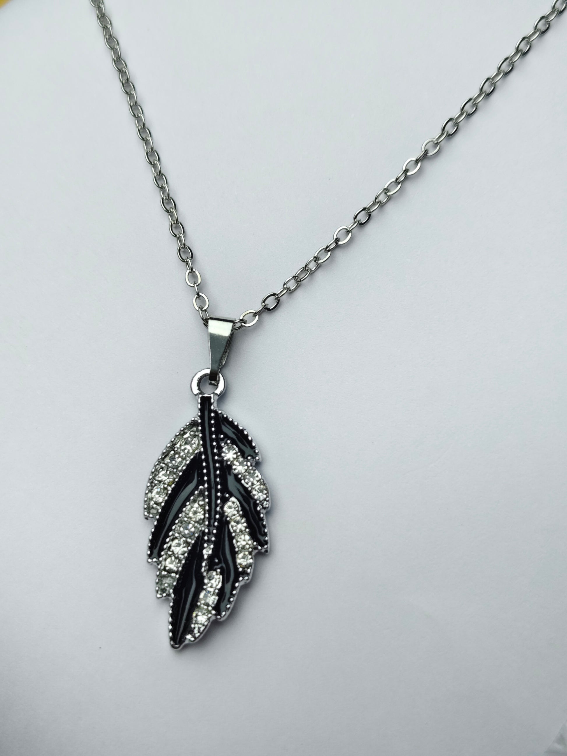 The Aurabraze Lux Pendant embodies timeless elegance and modern sophistication. Designed in the graceful shape of a leaf, it symbolizes growth, harmony, and natural beauty. The pendant features a stunning blend of brilliant-cut stones set against a deep black enamel backdrop, creating a striking contrast that captures light from every angle. Suspended on a polished silver-toned chain, this pendant adds a touch of luxury and refinement to any look. Perfect for those who love jewelry that speaks of grace, confidence, and effortless style.