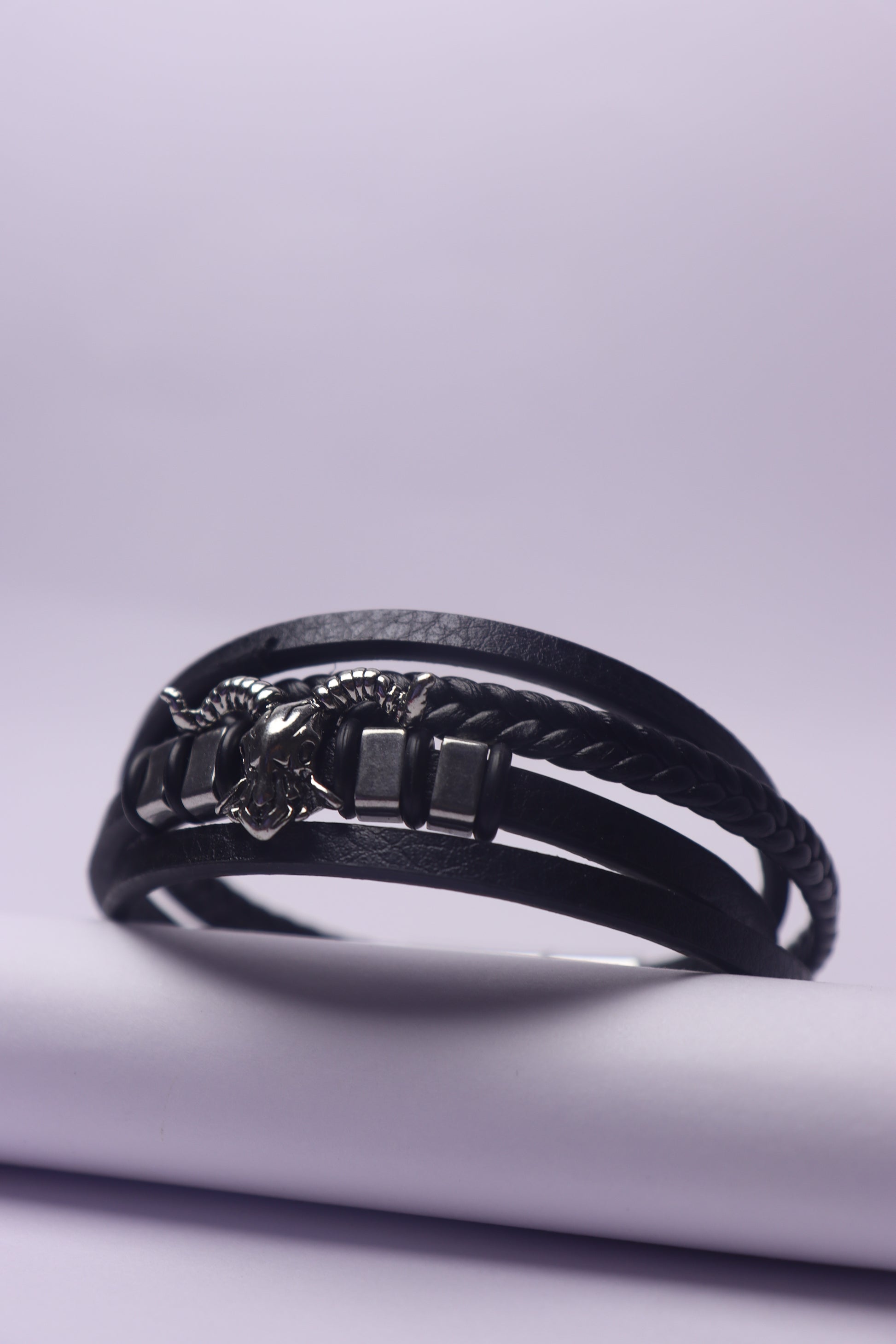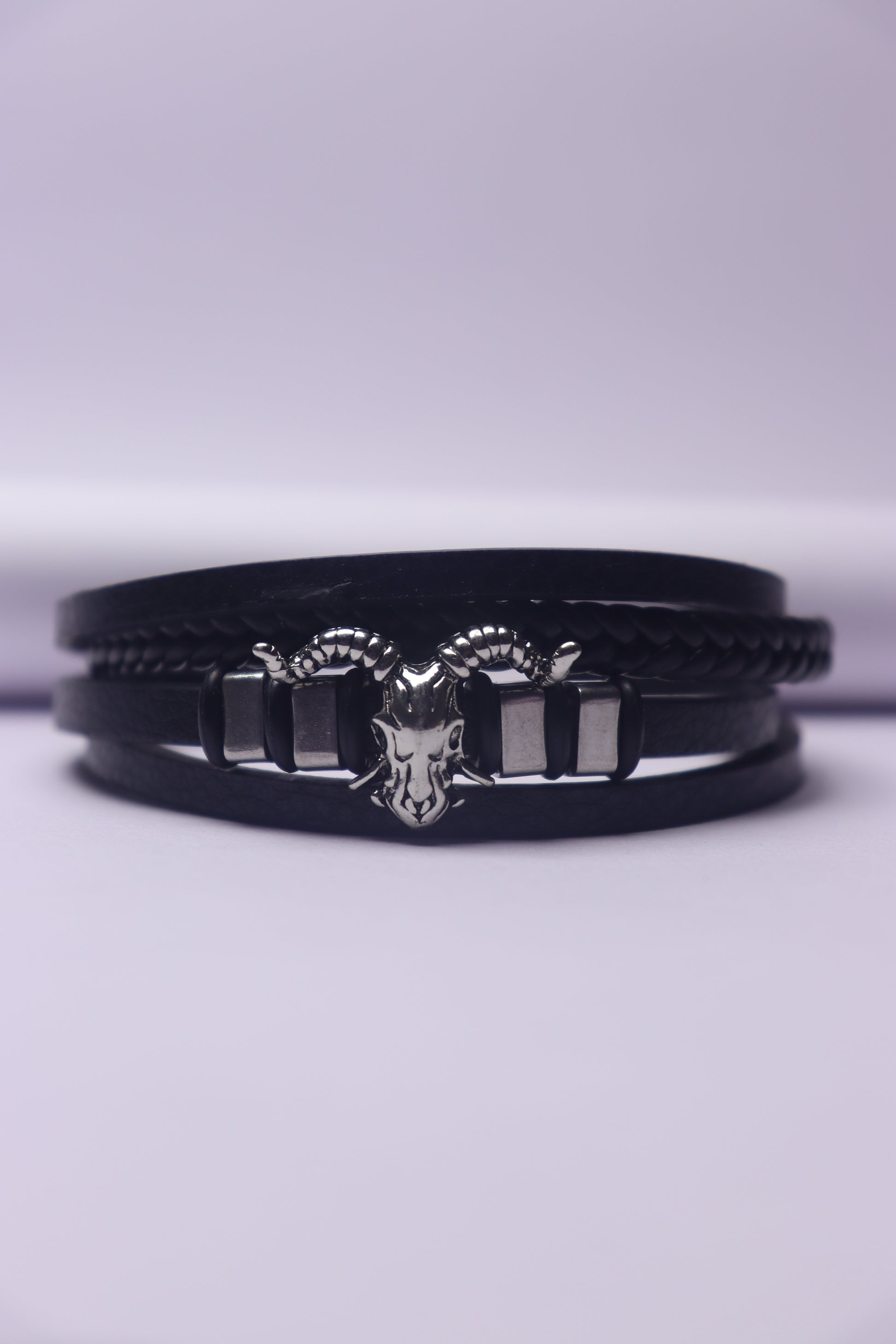 Unleash boldness with this premium black leather wrap bracelet, designed with layered straps—smooth, braided, and accented with metallic details. At its core lies a striking silver ram’s head charm, symbolizing strength, power, and resilience.